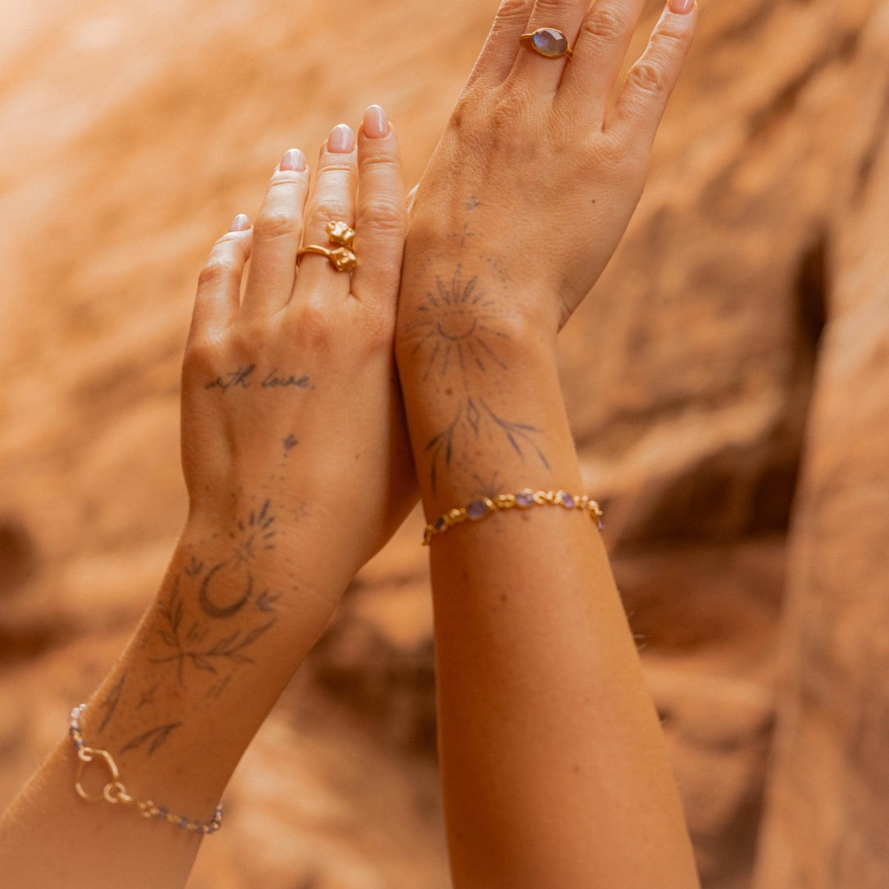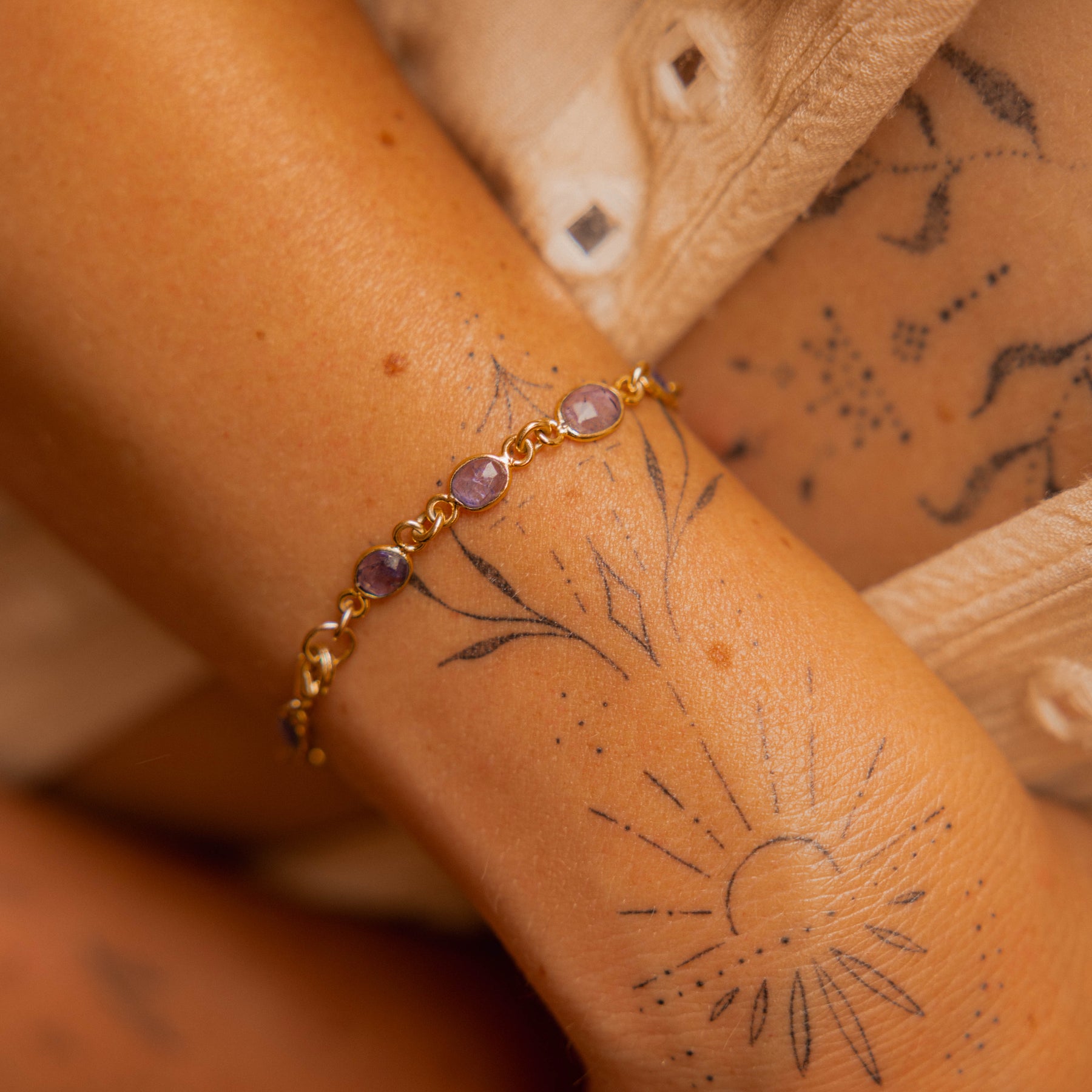 This unique tanzanite bracelet features Tanzanite bezel stones, our tanzanite is a violet purple hue and we use authentic tanzanite stones.