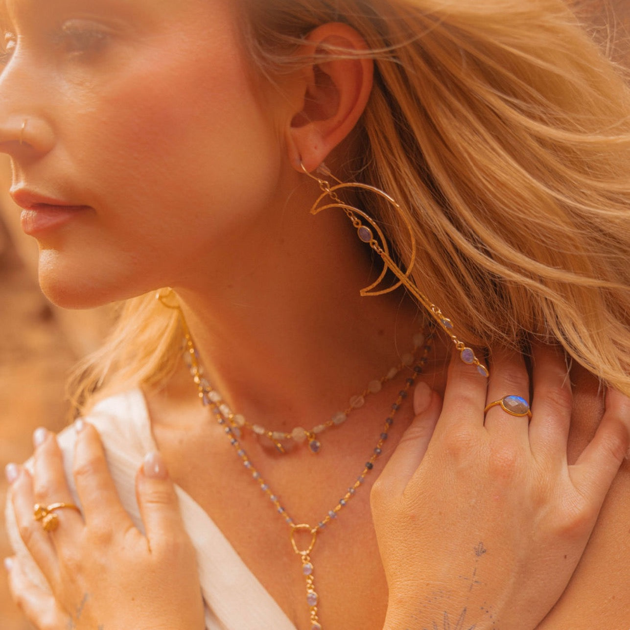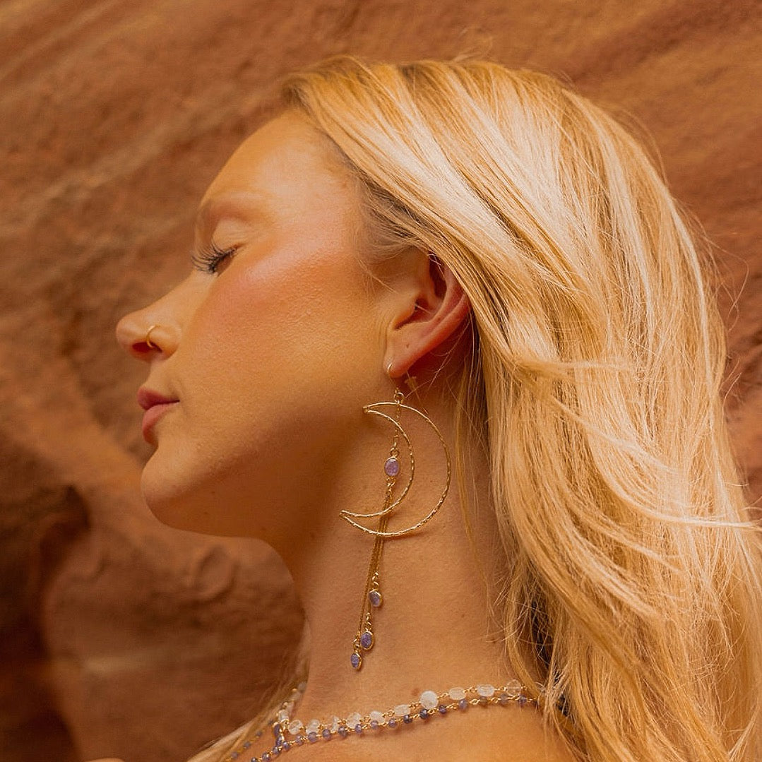 Absolutely Gorgeous Gold Crecent Moon Tanzanite Dangle Earrings. These statement earrings are very light weight and versatile. Wear them dressed up or casual. ✨