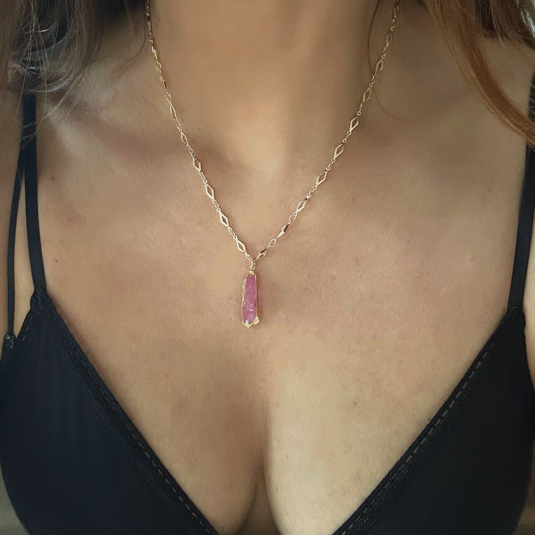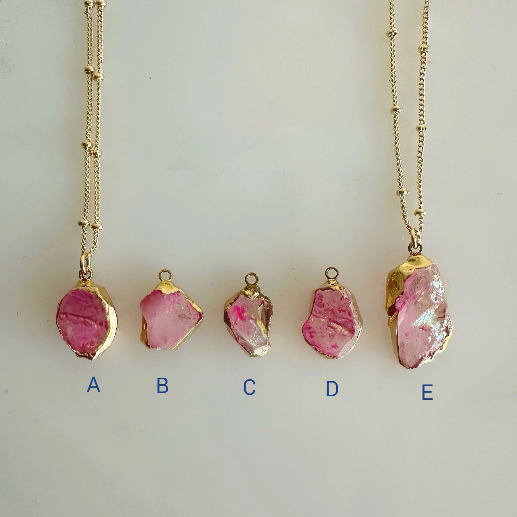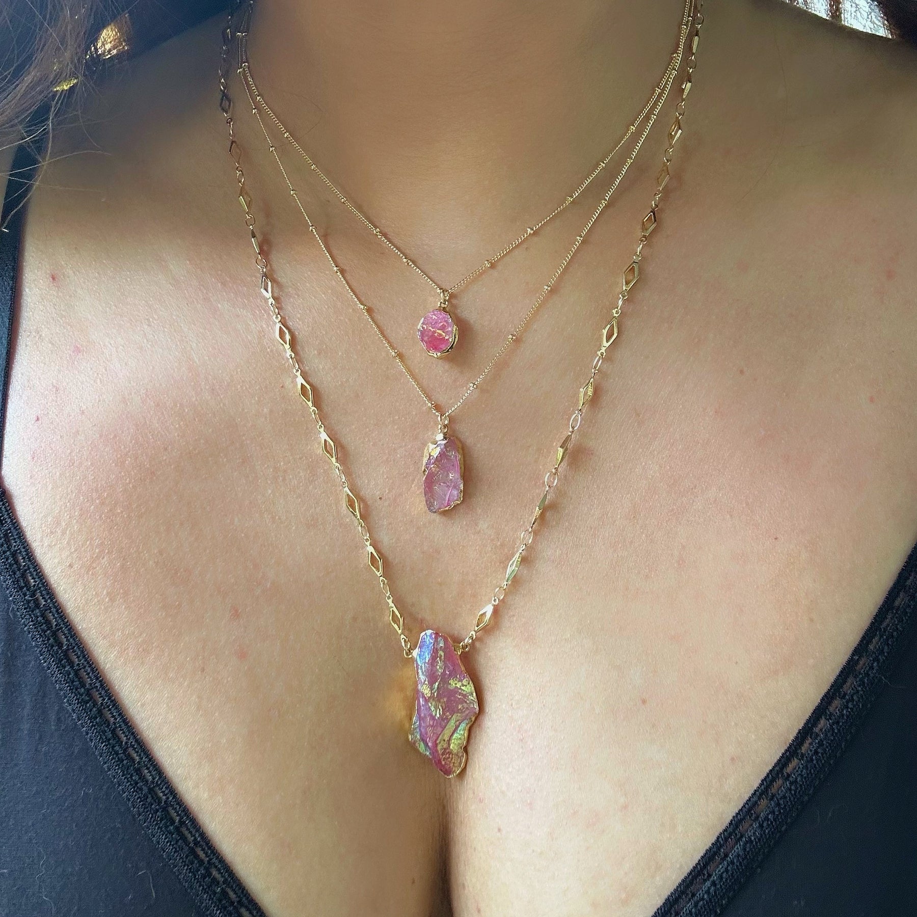Stunning Sunset Aura Quartz Gold Necklaces. These beautiful statement necklaces are authentic clear Quartz layered with pink sunset aura electroforming. The stones are raw Quartz and the aura varies in color and shimmers in sunset pink hues.