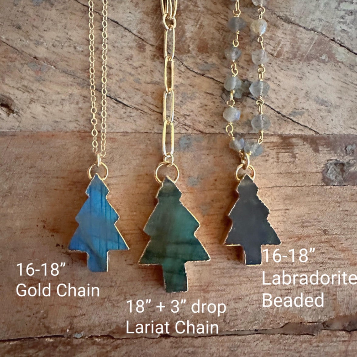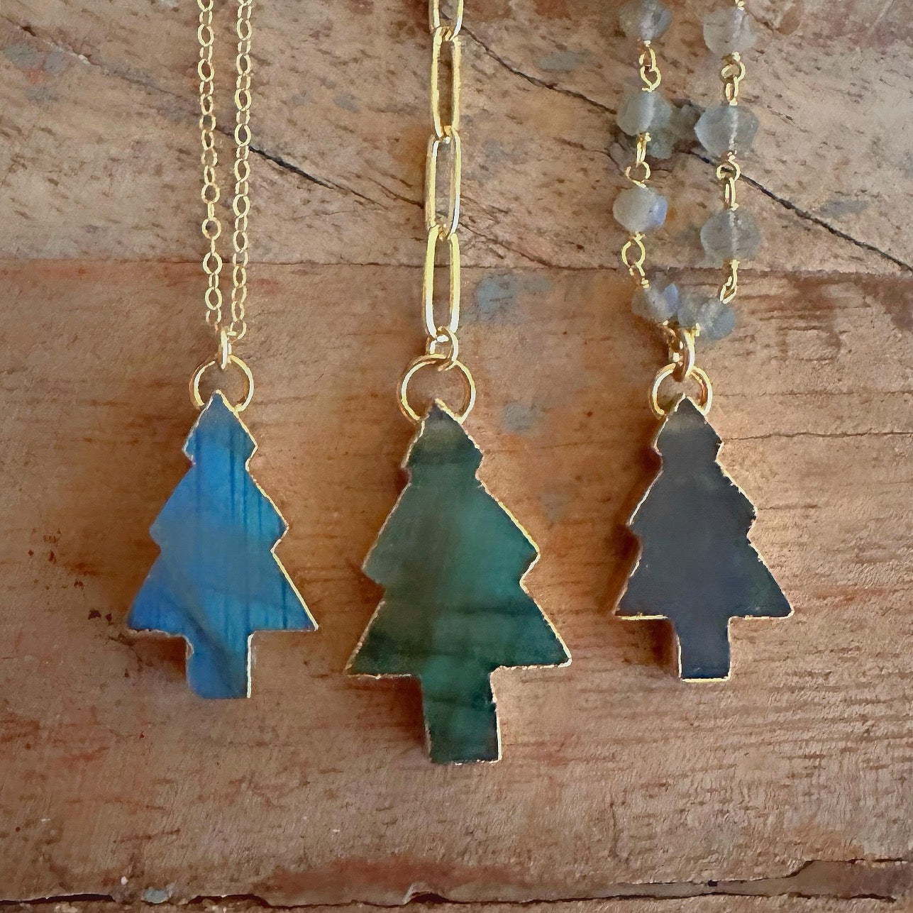 Beautiful Labradorite Pine Tree Evergreen Necklaces. Each beautiful and unique labradorite tree will glitter with different colors in the light.